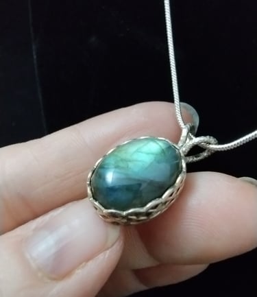 "I moved to Canada in 2005 and made a lovely life with my partner and our kids. Last year, I had a dream that I was walking on the beach in Vancouver and there were Labradorite pebbles scattered everywhere. I kept picking them up and tossing them aside, looking for the perfect one. I woke up before I found it and asked the universe to bring it to me in awake life. Imagine my delight when I saw this piece from Elisian Arts. The delicate silver work and brilliant shine of the stone told me it was mine. I wear it to bring a little lightness to my step and remind myself that I can release anything that isn’t right for me because I will always find what is."